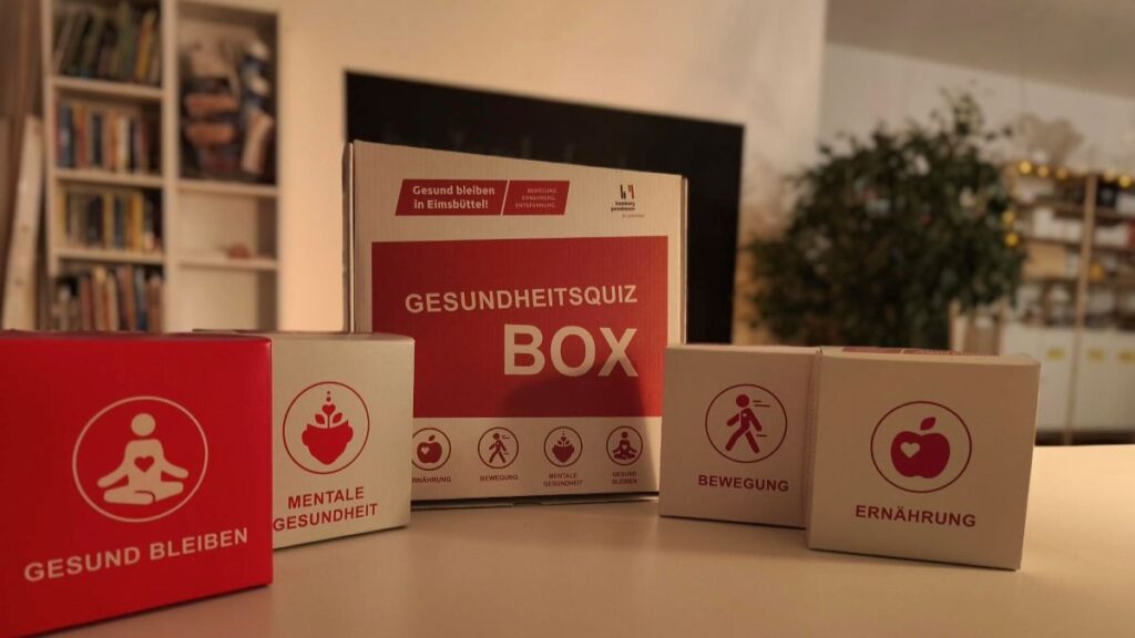 Die Quizbox richtet sich an Menschen aus Eidelstedt, Schnelsen-Süd und der Lenzsiedlung. Mit Fragekarten zu Bewegung, Ernährung, seelischer Gesundheit und Prävention kommen Teilnehmende leicht ins Gespräch. Die Sets enthalten neben vorformulierten Fragen auch Blankokarten – hier können persönliche Erfahrungen, Meinungen und Bedarfe festgehalten werden.